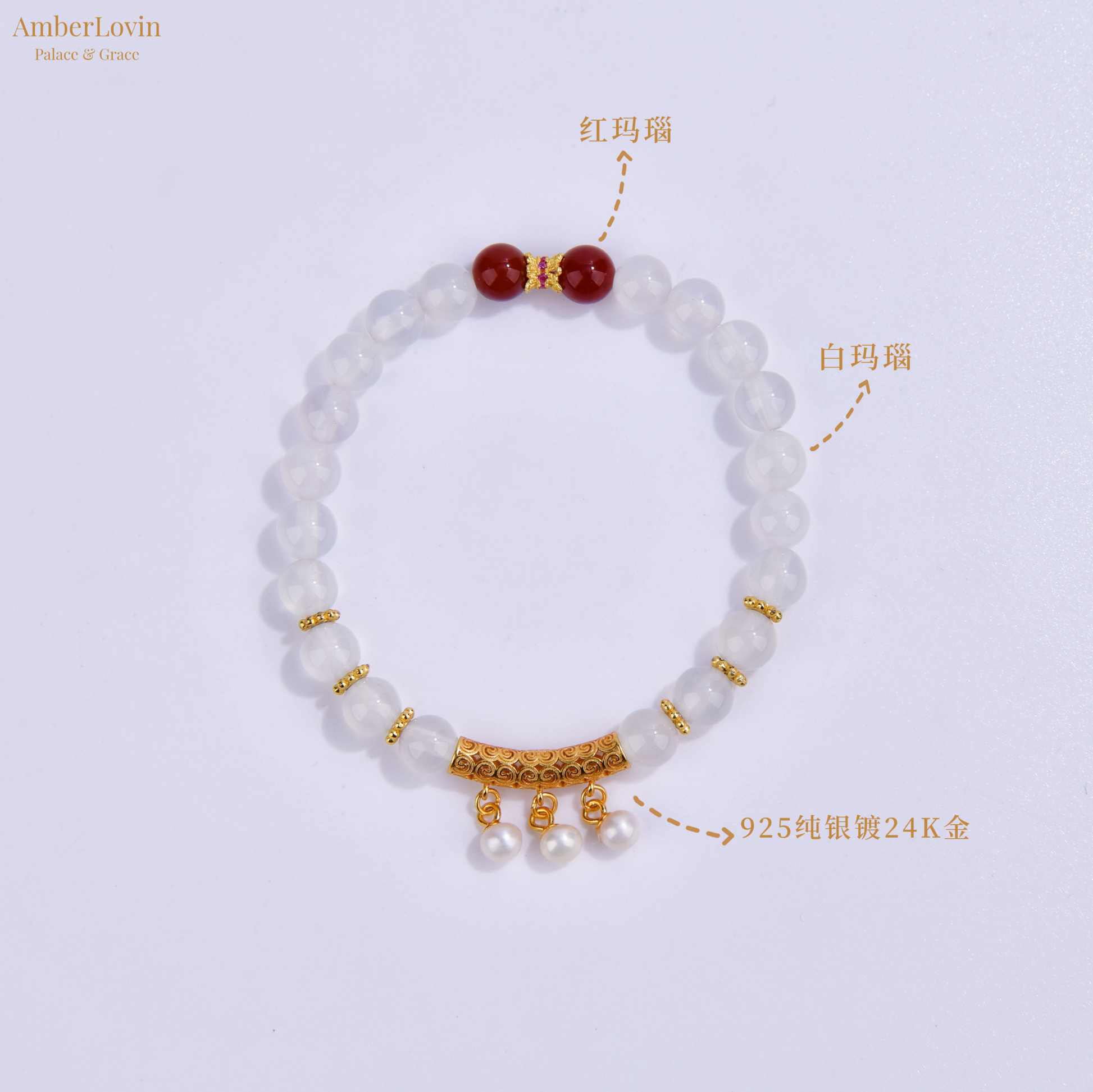 The "Scarlet Bell" bracelet, adorning the wrist, features a base of 6mm white agate beads, accented with red agate, and embellished with a gilded bell-shaped pearl pendant. It blends the elegant texture of the court with the gentle feel of agate, making it a delicate accessory that exudes a soft charm on a woman's wrist, embodying the gentle style of "a touch of courtly elegance, a world of graceful sentiments."