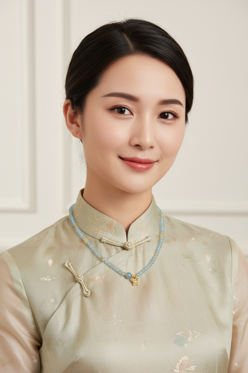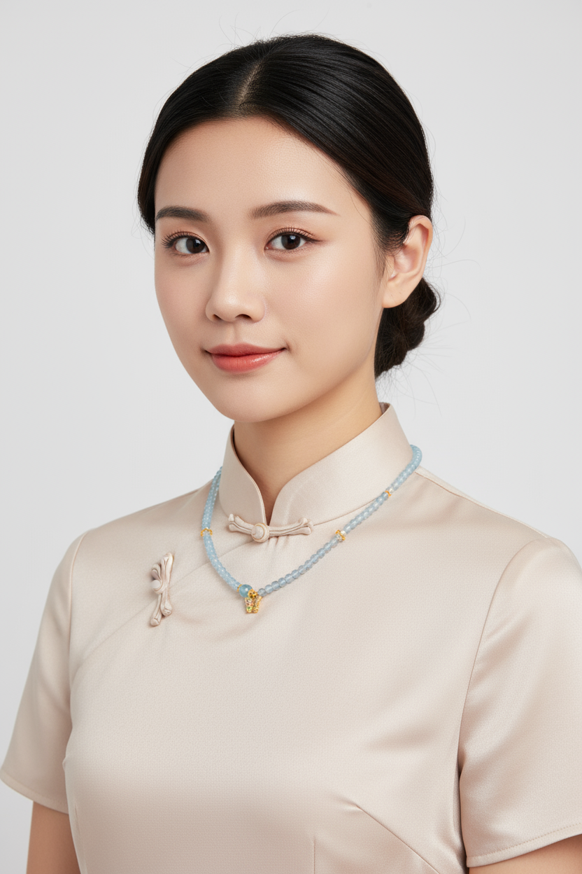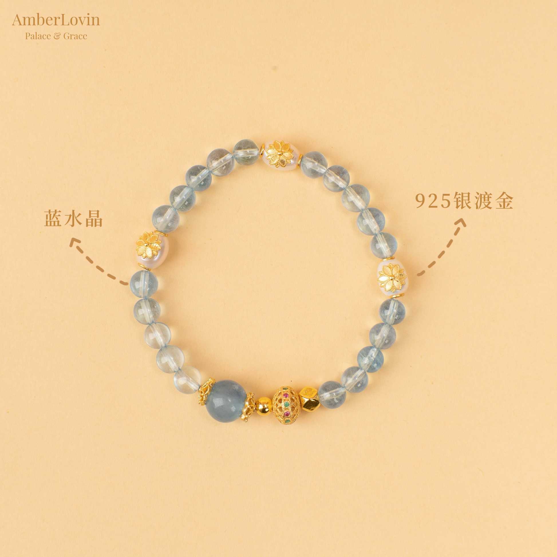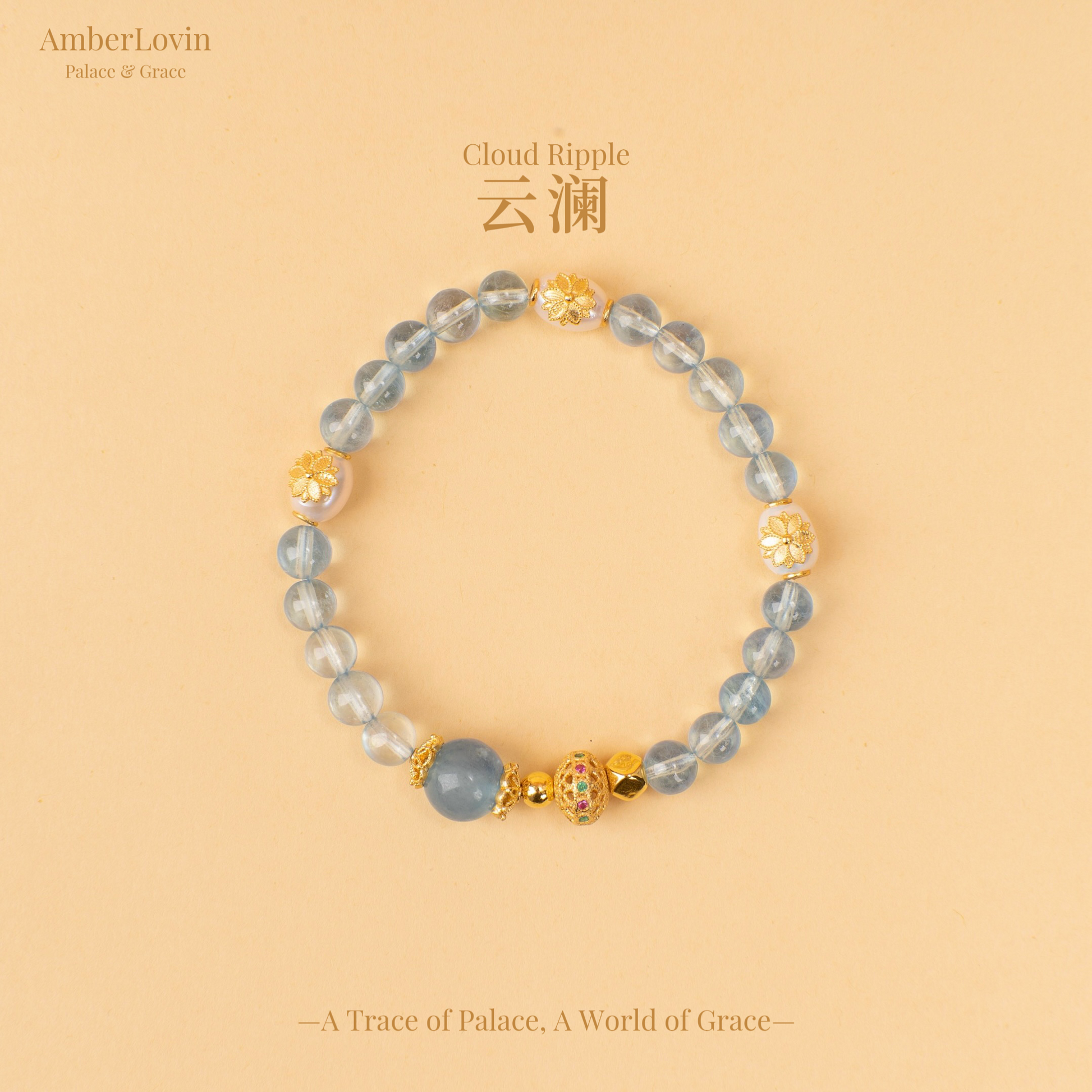 A poetic ode to the sea of clouds on your wrist and neck, the "Cloud Ripples" Aquamarine Set is inspired by natural aquamarine. Each 6mm diameter bead resembles a condensation of ripples in a sea of clouds, its clear blue hue displaying distinct layers and shimmering with an ethereal glow in the interplay of light and shadow. All accessories are crafted from 925 sterling silver plated with 24K gold, with intricate gilding and exquisite inlay showcasing the sophistication of court craftsmanship. Butterfly pendants and decorative beads add a touch of lively elegance. The necklace is 45cm long, and the bracelet is available in 14/15/16cm sizes to suit most wrist sizes. The set's design is cohesive, showcasing the harmonious blend of the serene beauty of the sea of clouds and the refined elegance of the court with every gesture.