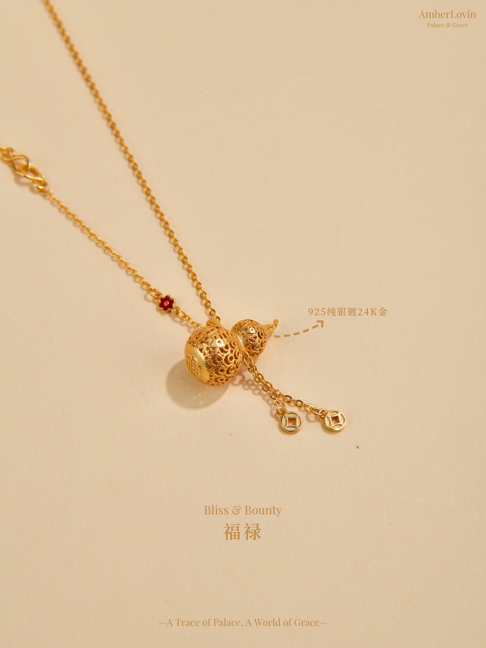 Inspired by the traditional Chinese auspicious meaning of "good fortune and prosperity," the "Fortune and Prosperity" necklace combines Eastern court aesthetics with modern jewelry craftsmanship, presenting a unique charm that blends warm gold with elegant lines. The main body features a gourd pendant crafted using an exquisite openwork technique, echoing the colorful pebbles adorning the chain. Delicate yet exuding nobility, it is an elegant gold piece symbolizing good luck, blessings, and abundance.