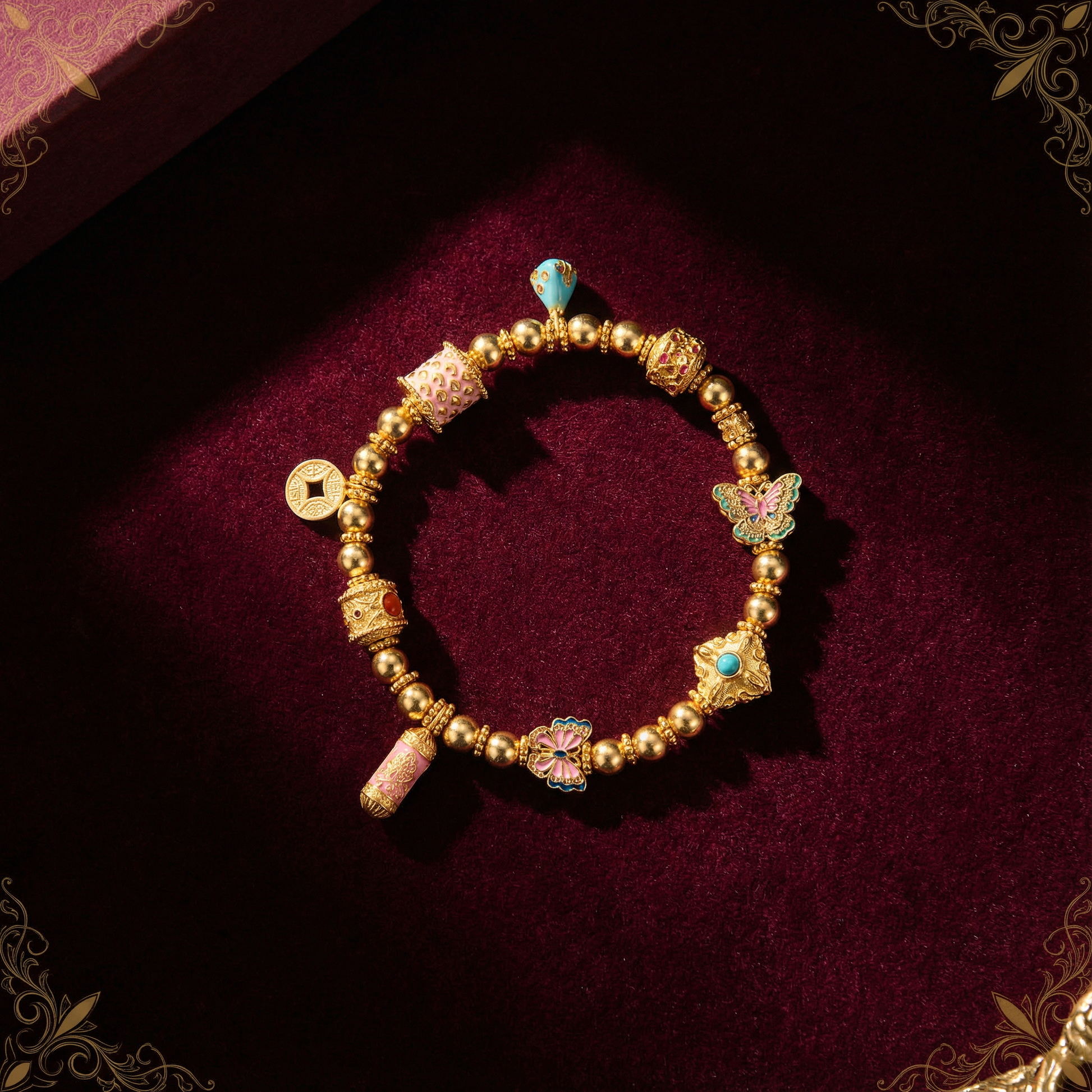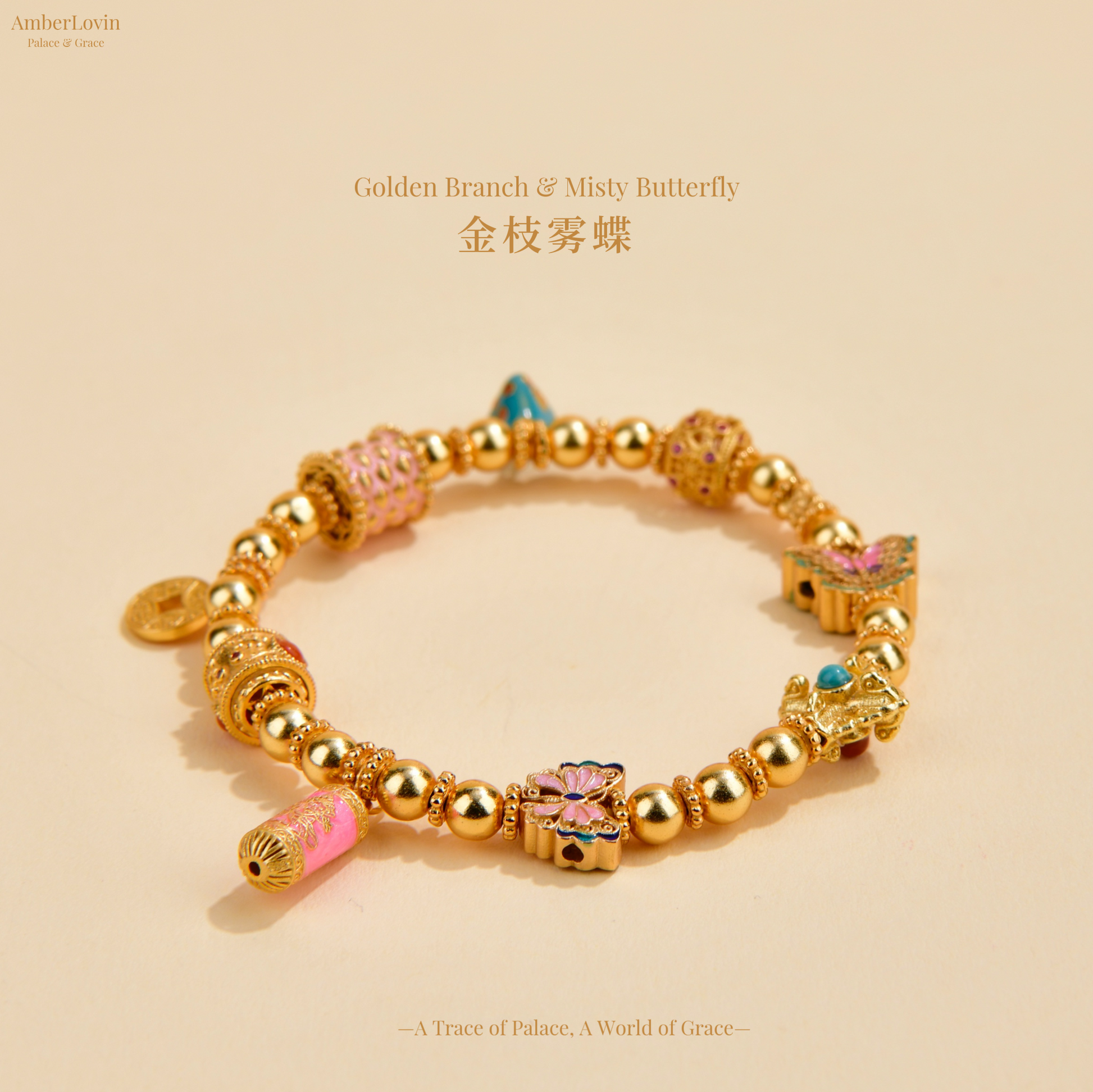 The "Golden Branches and Butterflies" bracelet draws inspiration from the aesthetics of the Eastern court. Crafted with 24K gold over a 925 silver base, it delicately presents the three-dimensional beauty of golden branches, butterflies, and courtly patterns. The entire bracelet is strung together with 6mm gold beads, interspersed with multiple cut beads, butterfly beads, and enamel techniques. The soft colors and exquisite textures create a golden garden that unfolds on the wrist.